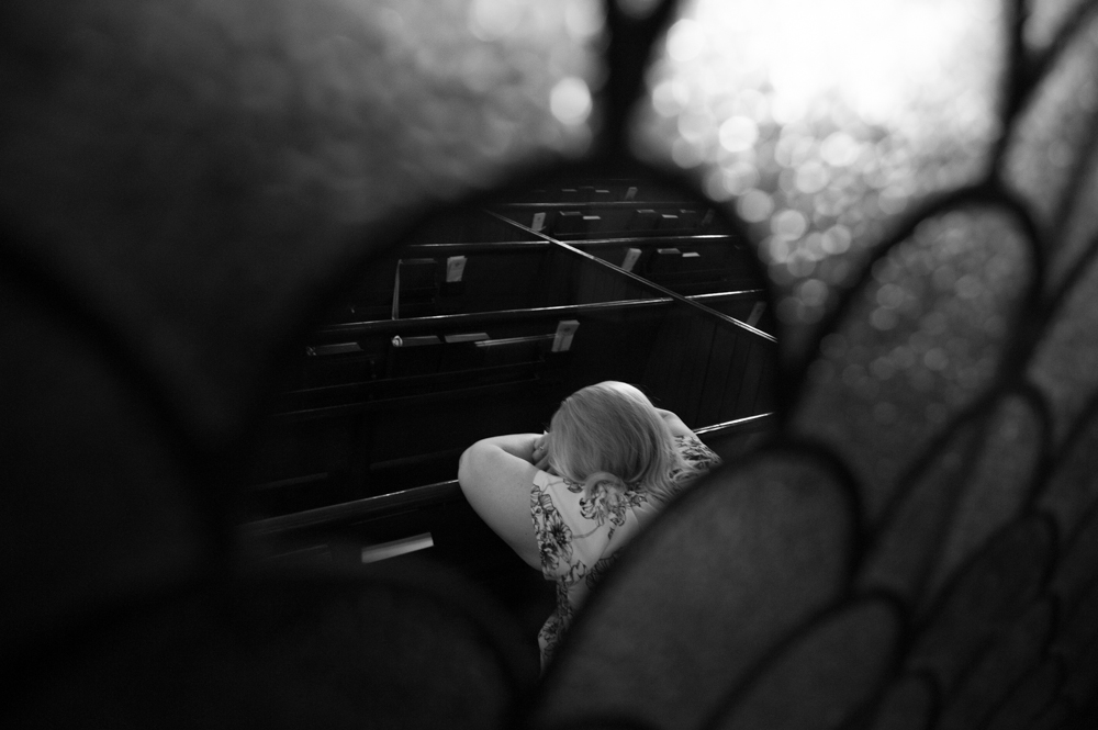 A woman praying at Old Stone Church in downtown Cleveland, OH